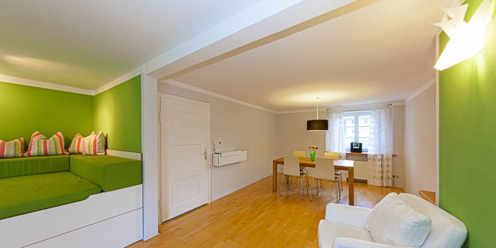 The old "Beihaus" from the 18th century is a home to a large farmhouse. The old building structure has a special charm and consists of "Bachkugeln", large stones that were used for wall construction at that time. The roof truss in the hayloft is exposed and the old wooden floorboards are stripped. There are three vacation apartments in this cottage. One per floor - connected with a central staircase.